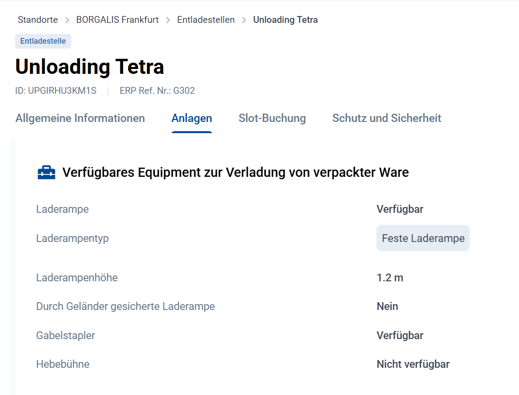 Damit dein Lieferant weiß, über welche Infrastruktur und Ausrüstung deine Entladestelle verfügt, kannst du alles, was vor Ort vorhanden ist, in Loady einpflegen.