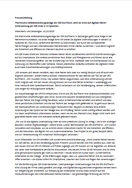 Die thermische Abfallbehandlungsanlage der SRS EcoTherm in Salzbergen geht neue Wege in der Fahrerkommunikation: Als erste Anlage ihrer Art bietet sie digitale Unterweisungen in derzeit 13 Sprachen an. Ziel ist es, sprachliche Barrieren zu überwinden, die durch den europaweiten Fahrermangel und den internationalen Fahrereinsatz immer stärker zunehmen – und damit zugleich die Sicherheit und Effizienz am Standort deutlich zu erhöhen.